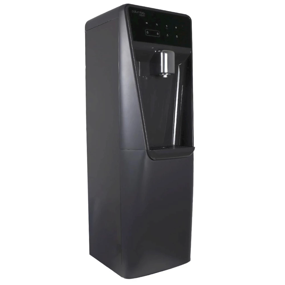 Cold, hot and ambient water dispenser. Equipped with reverse osmosis system and booster pump. Tactile selection buttons. Energy saving system. Wide space fot bottles and energy saving.
