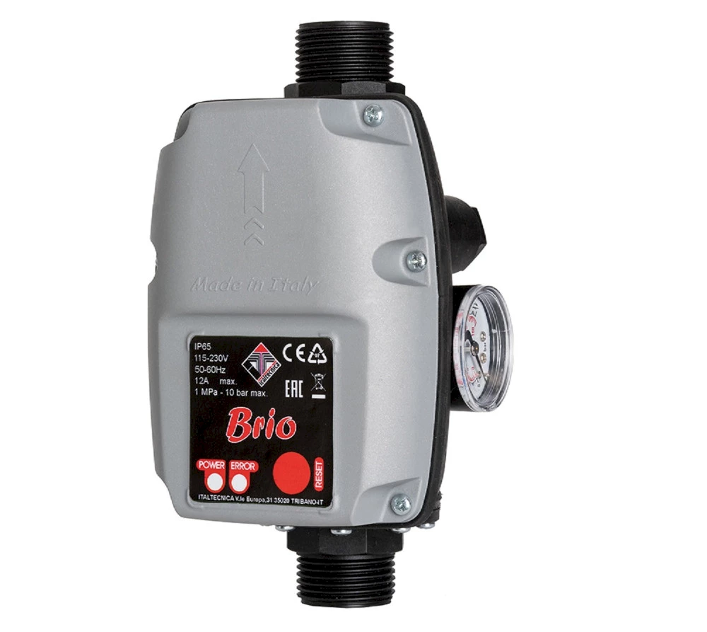 Електронният пресостат Brio e предназначен за управление на помпа с електродвигател. Brio стартира помпата при спад на налягането в системата (отваряне на кран) и я спира съответно при затварянето на крана. Електронният хидрофор Brio спира помпата при липса на вода, като по този начин я защитава от повреда, причинена от работа на сухо. Електронният пресостат Brio е с вграден таймер и стартира помпата периодично проверявайки за наличието на вода в засмукващата тръба. Препоръчително е да се използва в случаи, когато водата е без наличие на твърди частици. При условие че е наложителна такава употреба, трябва да поставите филтър преди входа на устройството.