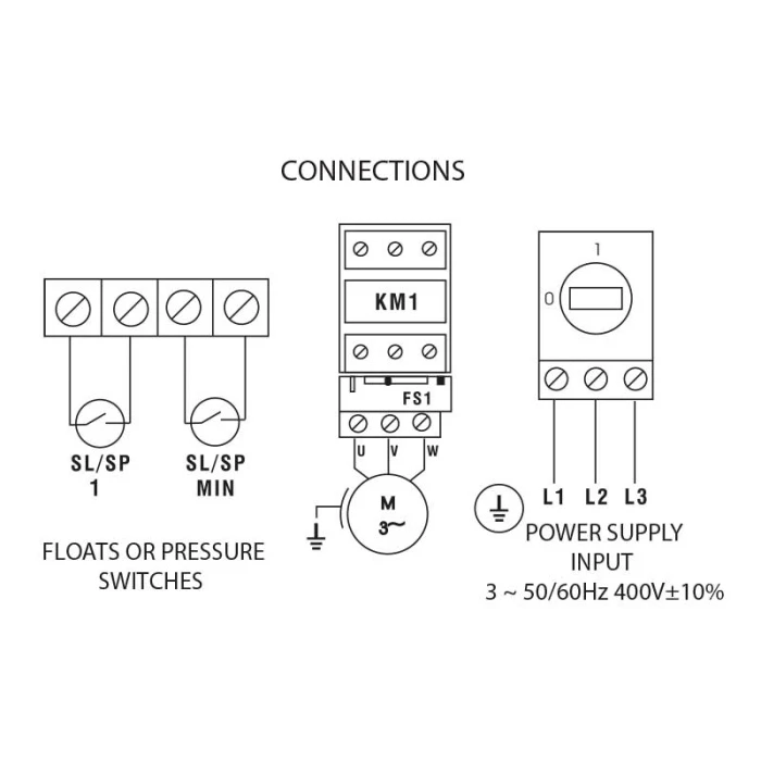 • Допълнителен вход за ниско напрежение за контрол на двигателя чрез пресостат или електрически поплавък с превключвател за нормално отворен или нормално затворен контакт.