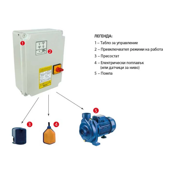 Таблa за управление и защита на една трифазна помпа с универсално приложение и микропроцесорно управление. Предлагат се модели за помпи с мощност до 16 kW. Таблата са с токава защита и защита от работа на сухо по cos Ф. Предназначени са за управление на помпи с директен старт. Могат да работят в 2 режима на работа: ръчен и автоматичен.