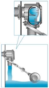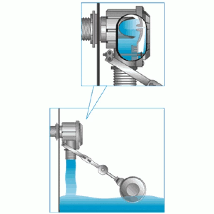 Преливен клапан с индирекно задвижване. Минималното входно налягане за плувак-вентилите тип QUICKSTOP е 0,2 bar.
