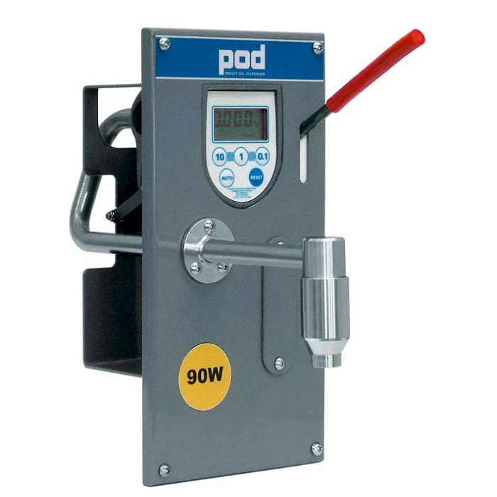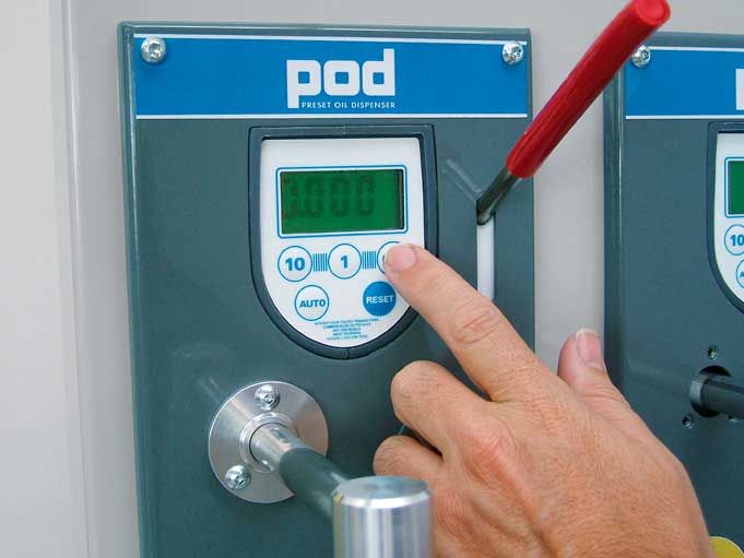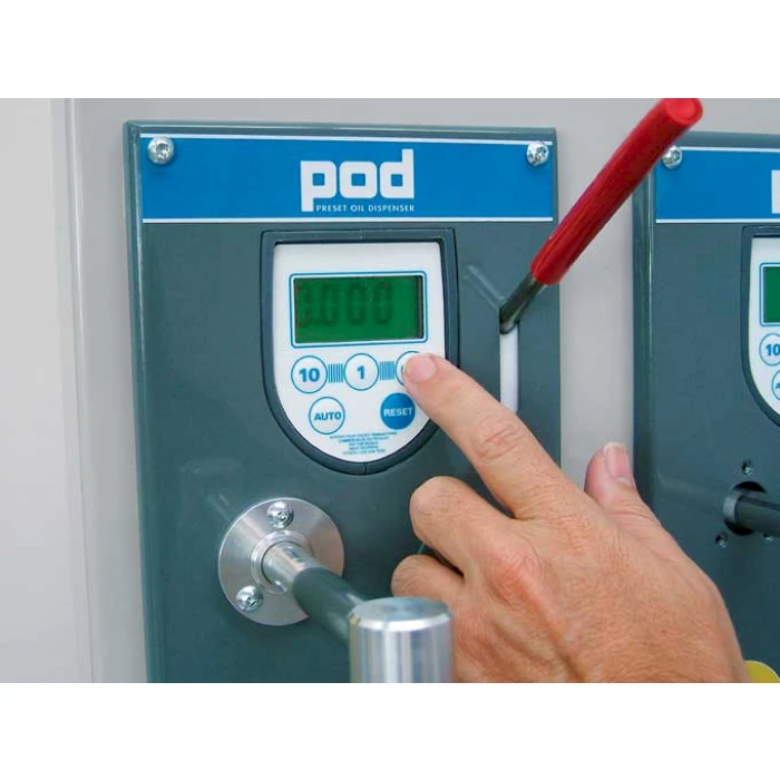 Система за зареждане на масло PIUSI POD. Желаното количество може да се зададе предварително и след достигане на посочената стойност зареждането прекъсва. Възможно е също и да се използва в ръчен режим. Разходомерът позволява да се получи точна информация. Функциите на системата POD са допълнени с много опции, които позволяват промяната на мерителните единици, могат да се запаметяват до пет стойности, както и да се калиброва разходомера. Системата се захранва от стандартни батерии, които се сменят лесно. Автоматичен противокапков клапан монтиран на единият край позволява лесно и чисто пълнене. Модулен поддържащ панел улеснява монтирането на системата.