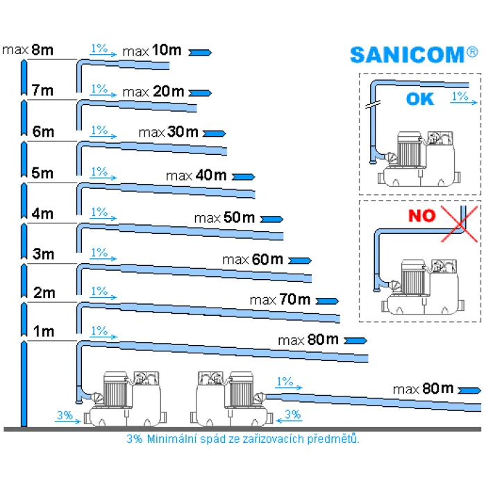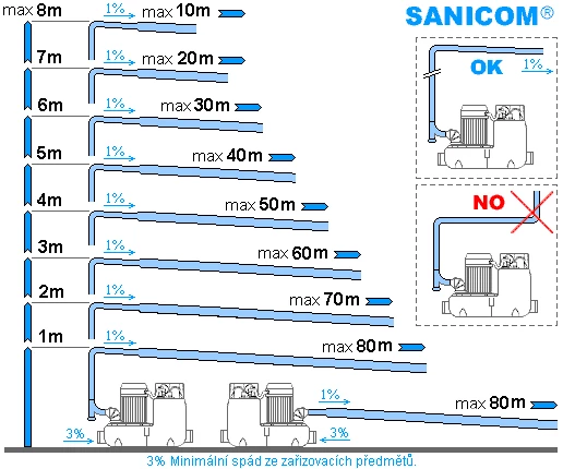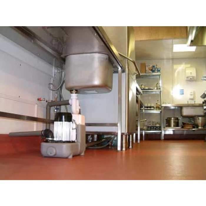 Sanicom е помпена станция от професионален клас. Високодебитната помпа и устойчивостта ú на висока температура, правят системата Sanicom приложима за високо натоварени обекти като ресторанти, барове, кафенета, обществени перални и др. Ако към системата се подвързва душ кабина, нивото на душ коритото трябва да бъде с 15 см над нивото на пода.