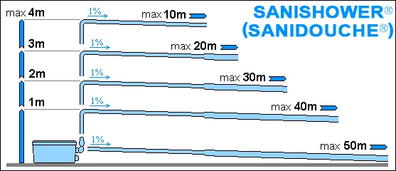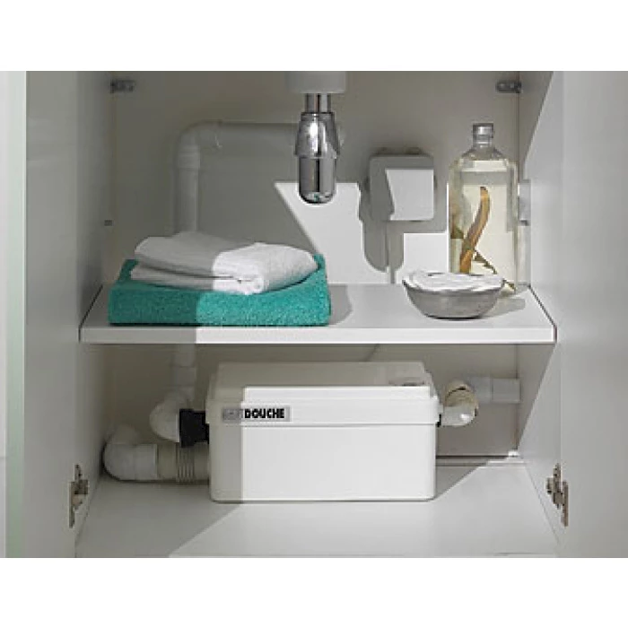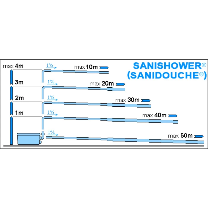 Sanishower е компактна система за изпомпване на отпадни води от душ, мивка или биде. Малките размери и ниското ниво на стартиране, позволяват Sanishower да бъде монтирана под душкабината или шкафа на вашата баня. Sanishower има и редица други приложения, като например опцията за ползването ú като помпа за кондензат. Максималната височина на изпомпване е 4 метра.
