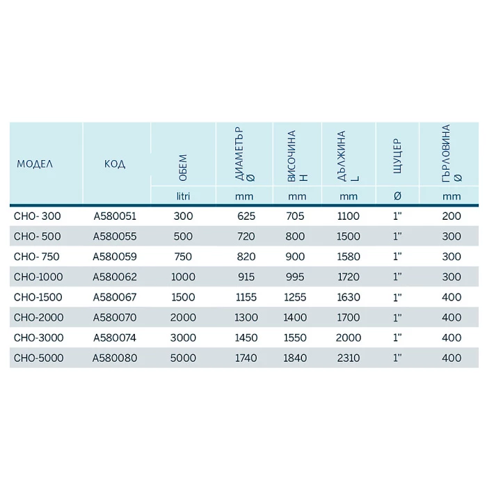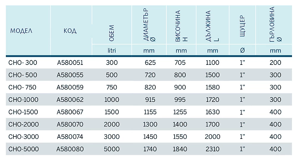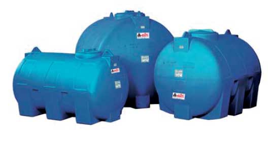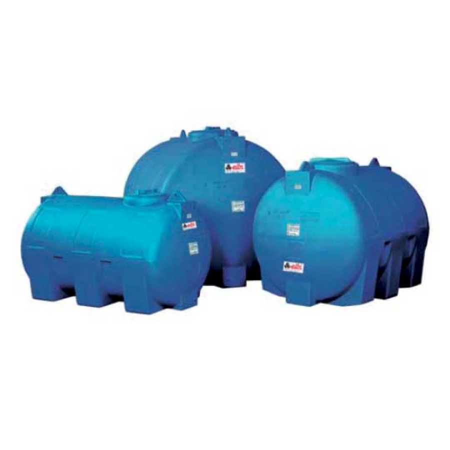 Хоризонтални резервоари за питейна вода. Изработени са от полиетилен. Предлагат се в модели с обем от 300 до 5000 литра. Оборудвани са с един месингов накрайник с външна резба 1".